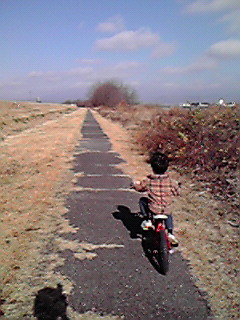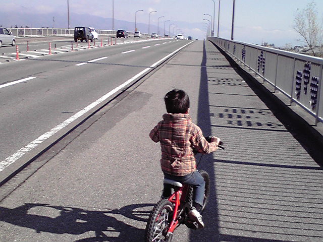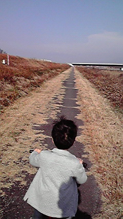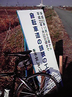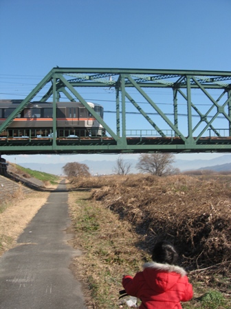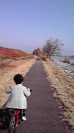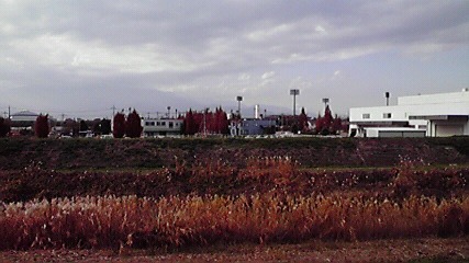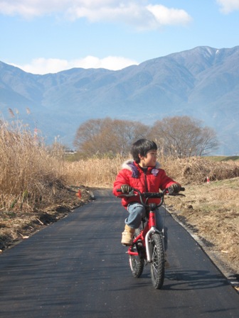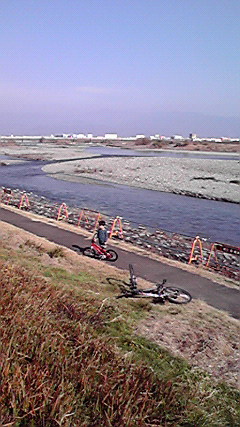 「やまなみの湯」の南から土手を越えて、釜無川サイクリングロードへ。