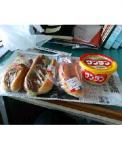 今日の昼飯。左から焼きそばパン、ハッシュポテトパン、マンゴクリームのパン。それと、ペヤングワンタン。カロリー高そうね。